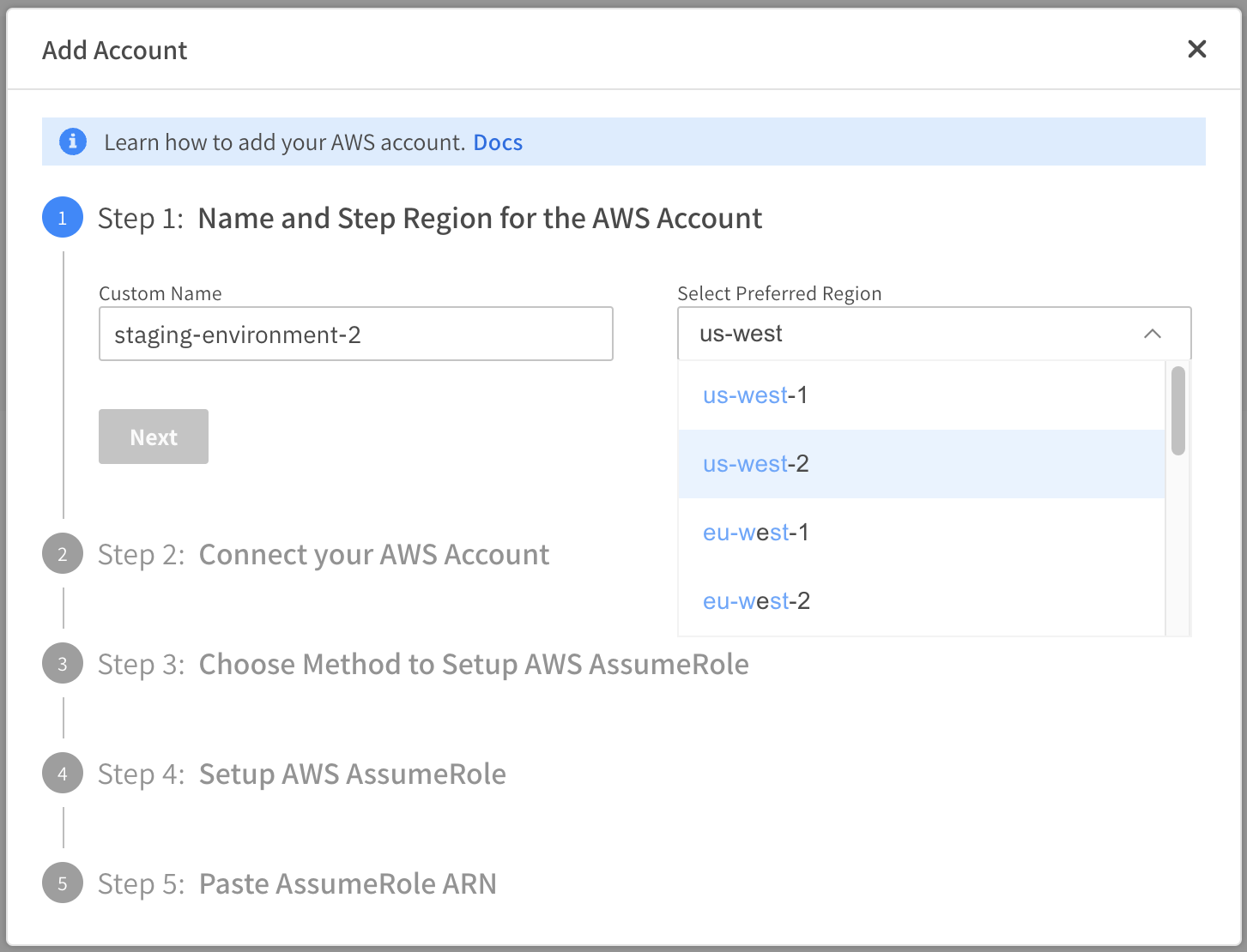 In the Custom Name field, enter a name for the integration and select the default AWS region for the account. Click Next.